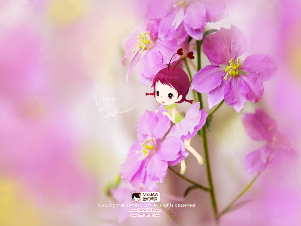 壁纸简介:好不容易帮可爱的粒桃儿拍了张照片哦,淘气的她总是绕着美丽的飞燕草飞来飞去!